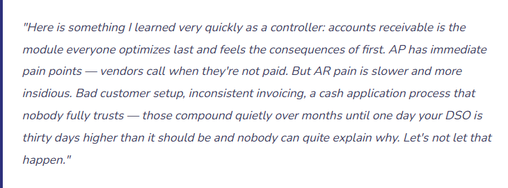 From one recovering controller to another: AR is the module that most directly reflects the health of your customer relationships and the discipline of your revenue operations. A clean AR process — well-configured, well-trained, and actively managed — is one of the clearest signals of a finance team that knows what it’s doing. It shows in your DSO. It shows in your audit. It shows in how your customers talk about working with you.