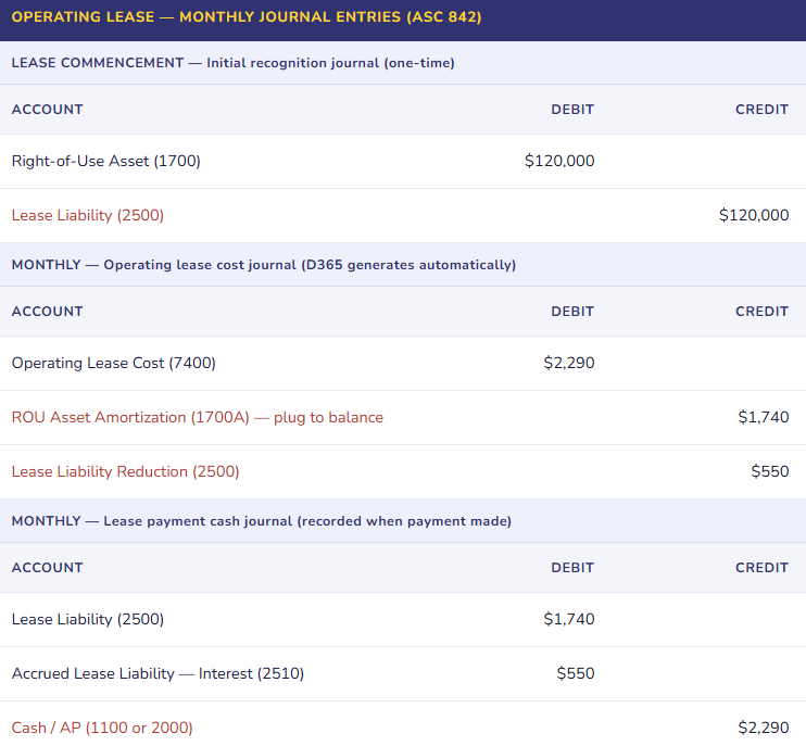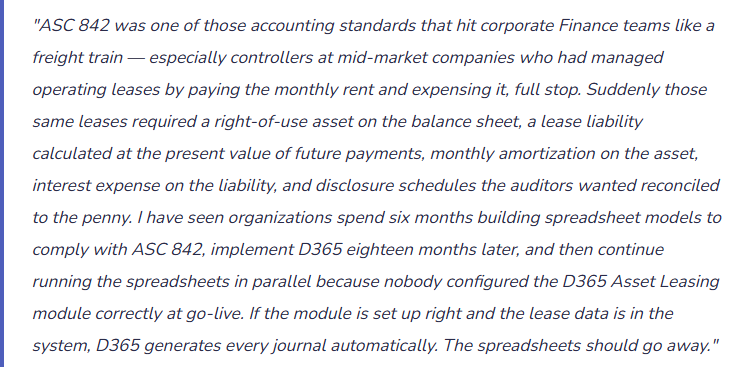 Fix: The lease population for ASC 842 / IFRS 16 includes every arrangement that gives the organization the right to control the use of an identified asset for a period of time in exchange for consideration — regardless of whether it is called a “lease.” Before configuring D365 Asset Leasing, conduct a complete lease inventory: review contracts, AP vendor payment history, equipment service agreements, real estate agreements, and any arrangement where a fixed payment is made in exchange for use of an asset. Every qualifying arrangement is a lease. Enter all of them in D365 at go-live. The dollar threshold for the low-value exemption (IFRS 16) or short-term exemption is the only legitimate reason to exclude a qualifying arrangement.
