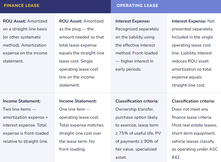 Under ASC 842, leases are classified as either finance leases (formerly called capital leases) or operating leases. Both require balance sheet recognition. The income statement treatment differs: