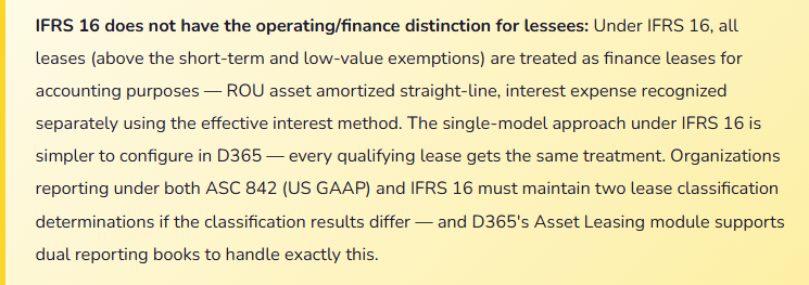 - Both ASC 842 and IFRS 16 allow optional exemptions: leases with a term of 12 months or less (short-term exemption) and, under IFRS 16, leases for which the underlying asset has a low value when new (low-value exemption, typically assets valued below approximately $5,000). Leases that qualify for an exemption are expensed on a straight-line basis and are not recognized on the balance sheet. D365 Asset Leasing allows short-term leases to be tracked without generating ROU asset and liability journal entries. Finance must apply the exemptions consistently and document the policy — selectively applying exemptions is not permitted under either standard.
