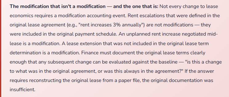 - Process modifications as new leases — you lose amortization history and break the rollforward disclosure