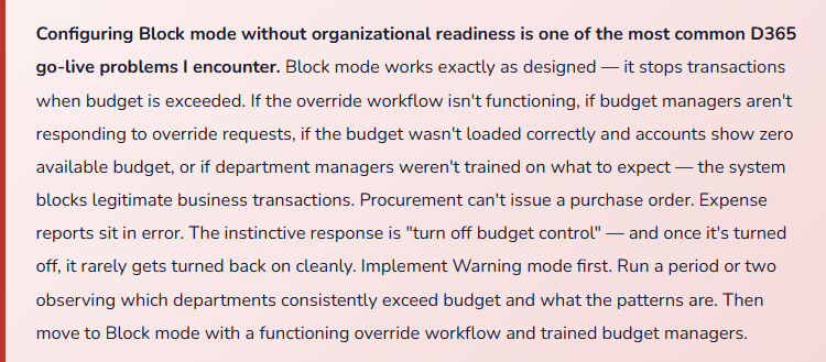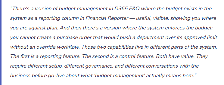 Budget transfers require governance: who can request a transfer, who approves it, what documentation is required. Budget Control in D365 can enforce this through the budget register workflow — a transfer request routes to an approver before the available budget is adjusted. Without that workflow, budget transfers are self-service, which defeats the purpose of the control. The workflow configuration for budget transfers is as important as the control configuration itself. Define it before go-live, not after the first department head asks for a transfer and discovers they can change their own budget without anyone’s approval.