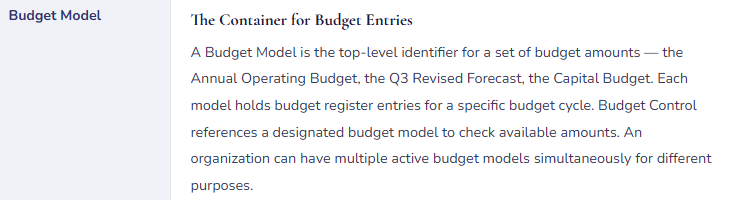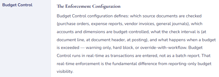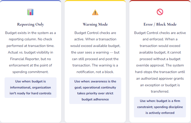 Budget Control: The enforcement layer that checks actual spending commitments (purchase orders, expense reports, journal entries) against available budget before allowing them to proceed. Budget Control is what makes “over budget” a system event rather than a reporting observation. It can be configured to warn only, or to block the transaction until an override is approved.