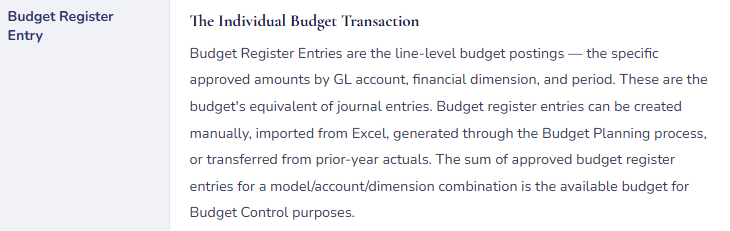 Budget Planning: A structured process for building the budget — worksheets, workflow for budget submissions and approvals, templates, scenario modeling, allocation rules for distributing budget from high-level to detailed account/dimension combinations. Budget Planning is the process of creating and approving the plan. Output is a set of budget register entries that represent the approved budget in the system.