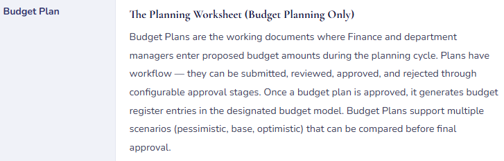 | Planning Scenario | Alternative budget versions within a single planning process — Base Case, Optimistic, Conservative. Each scenario appears as a column in the Budget Plan worksheet for side-by-side comparison. | Scenario names and descriptions; the final approved scenario that generates budget register entries |