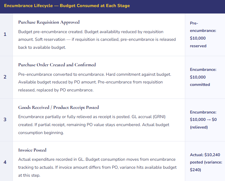 At any point in this cycle, Finance can see available budget by account and dimension — showing original budget, budget register adjustments, pre-encumbrances (outstanding requisitions), encumbrances (outstanding POs), and actual expenditures. Available budget = Original + Adjustments − Pre-encumbrances − Encumbrances − Actuals. That complete picture is what makes budget control meaningful. Without encumbrance, available budget is just original minus actuals — which ignores all the commitments already made but not yet invoiced.