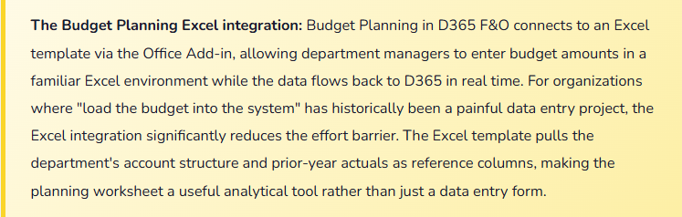 D365 F&O’s Budget Planning module provides workflow-driven budget preparation that replaces the email-and-spreadsheet budget process many Finance teams are managing manually. The planning process is configured through Budget Planning Configuration in the Budgeting module, which defines the stages, participants, and data flows in the annual budget cycle.