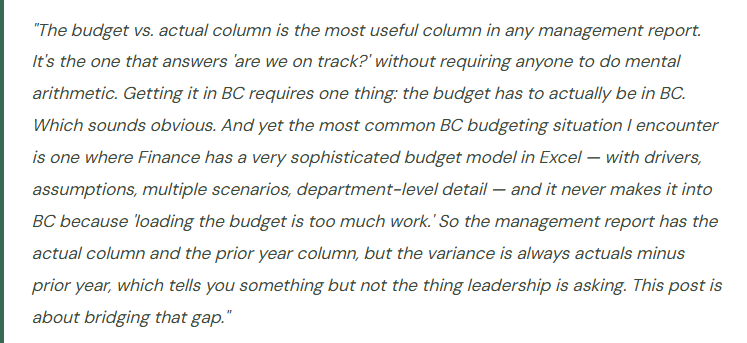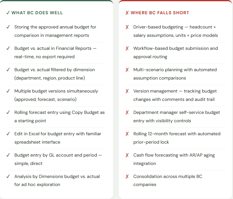 This is not a criticism of BC. It’s a recognition that budgeting and forecasting for a $50M business with five departments and multiple scenarios is a planning process, not just a data entry task. A dedicated planning tool handles the process. BC handles the comparison. Both are doing what they’re designed for.