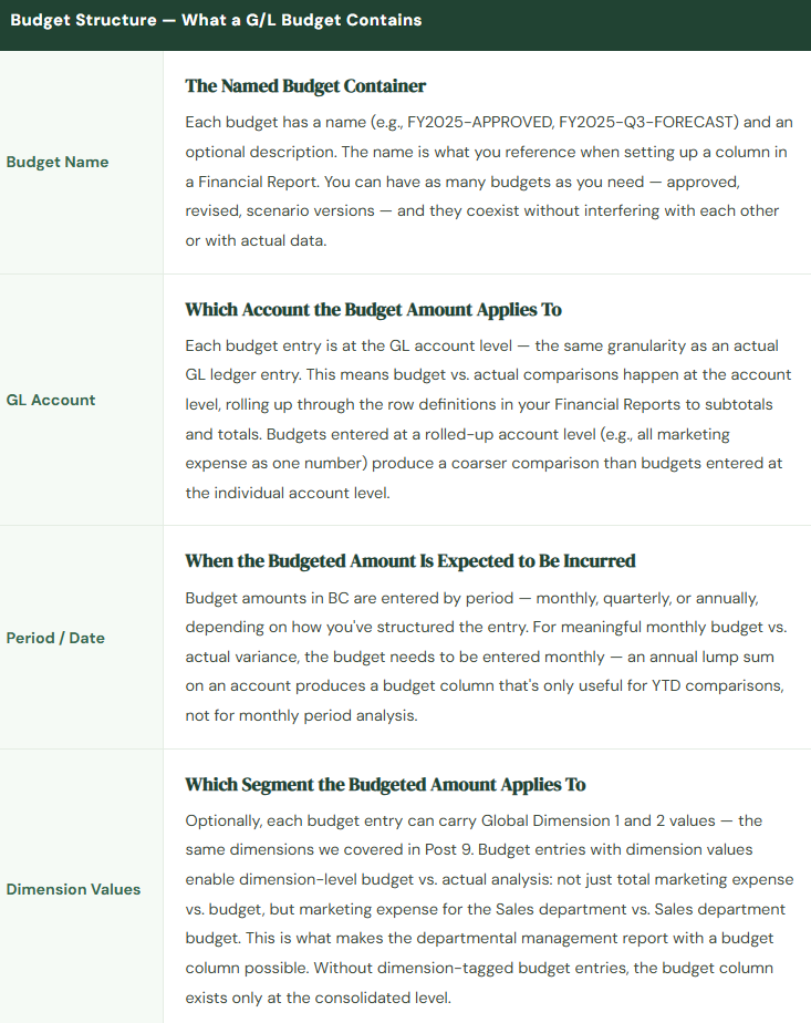 BC’s native budget tool is straightforward: you create a G/L Budget — a named budget that holds planned amounts by GL account, period, and optionally by dimension values. Once a budget is created and amounts are entered, those amounts become available as a column in Financial Reports and in the Analysis by Dimensions view. The budget doesn’t flow through the posting setup, it doesn’t affect the trial balance, and it doesn’t interfere with actual transaction processing — it’s a parallel set of planned amounts that BC stores and makes available for comparison.