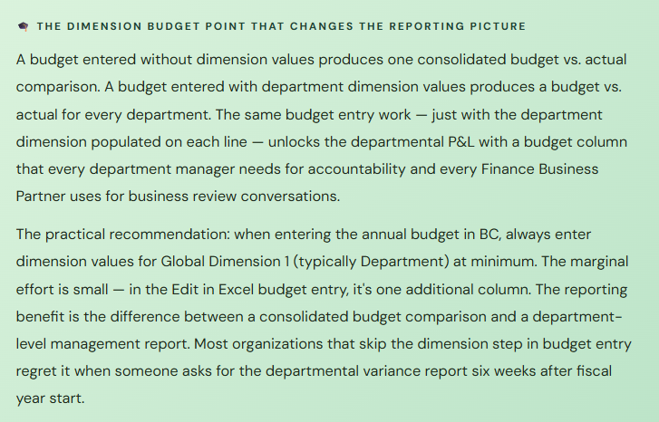 → Enter budget amounts with Global Dimension 1 values at minimum. In the Edit in Excel budget entry view, add the Dimension 1 column and populate it for every line. This is the single most impactful step in making BC’s budget feature useful for departmental management reporting. The effort is modest; the reporting benefit is significant.