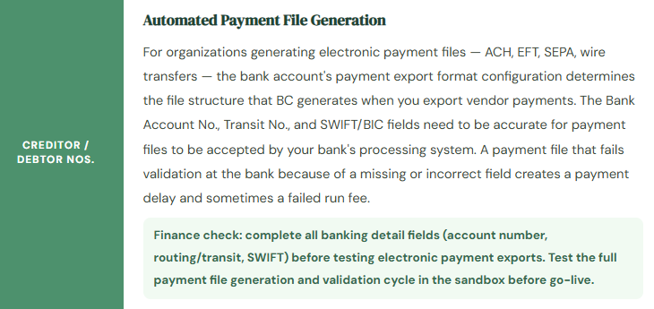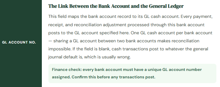 Every bank account in BC has a Bank Account Card — the record that connects the physical bank account to the general ledger and controls the behavior of every cash transaction processed through it. A bank account card that’s set up completely and correctly makes every downstream process — payment processing, bank statement import, reconciliation — more reliable. One that’s missing key fields creates friction and errors in every single cash transaction for the life of the implementation.