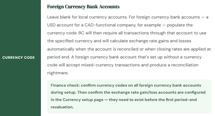 Organizations with foreign currency bank accounts have two configuration requirements beyond the basic bank account setup that Finance needs to own explicitly.