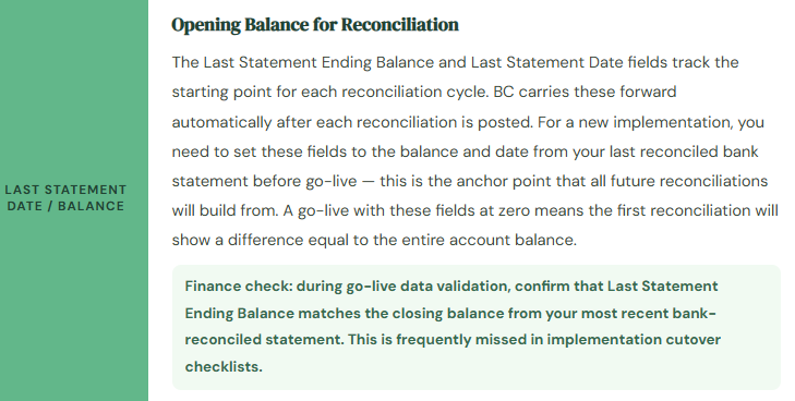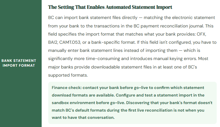 → Configure bank statement import during implementation, not as a post-go-live enhancement. Identify the file format your bank provides, test the import in sandbox, and document the export/import steps as part of the bank reconciliation procedure. If your bank doesn’t provide a format BC supports natively, check whether a custom import format can be configured or whether a bank data service (Yodlee, etc.) can provide normalized files.