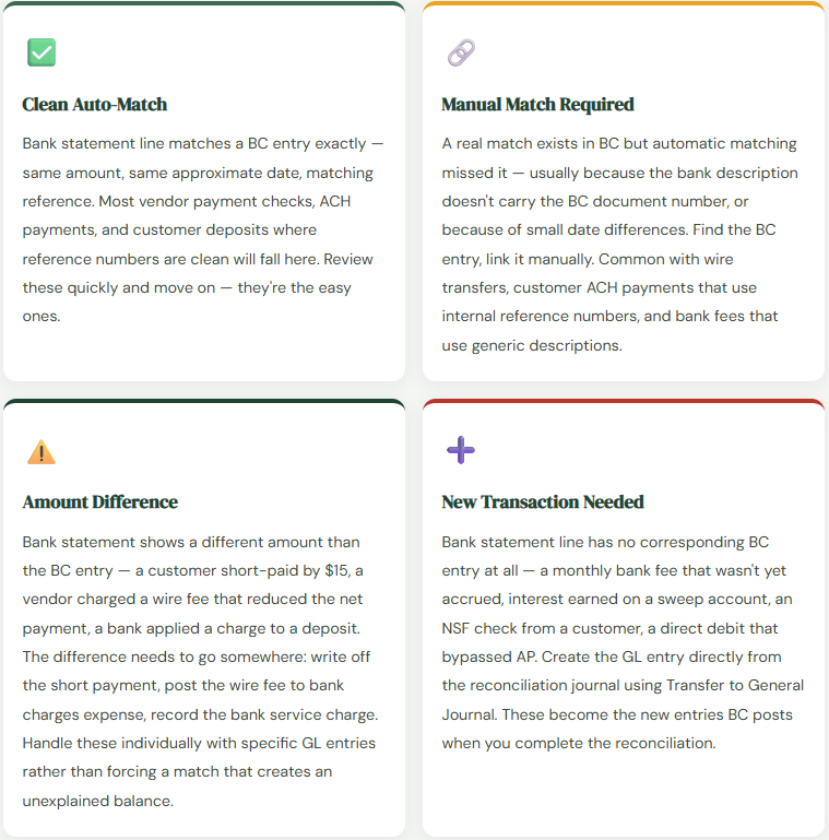 Before posting, BC shows the difference between the bank statement ending balance and the sum of the matched transactions. This number should be zero when everything is correctly matched. A nonzero difference means either an unmatched statement line or a transaction in BC that hasn’t appeared on the statement yet. Investigate the difference — don’t post with a nonzero balance and assume it will resolve itself. Post when the difference is zero. BC updates the bank account’s Last Statement Balance, closes the matched entries, and posts the GL entries for any new transactions created during reconciliation.