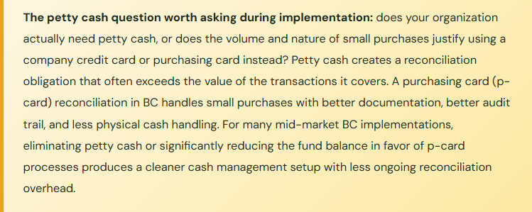 • Treat petty cash as an informal system outside BC — give it a bank account record and reconcile it