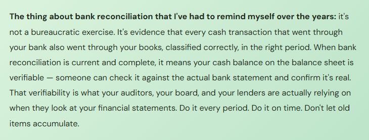 → Reconcile high-volume bank accounts weekly. Reconcile all accounts by the fifth business day after period-end at the latest. Set a policy: any outstanding item more than 30 days old gets reviewed and investigated before the next reconciliation cycle. Make this a named task in the period-close checklist with an assigned owner.