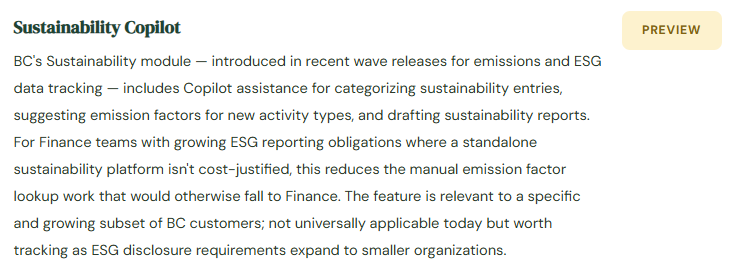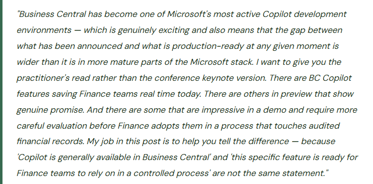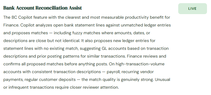 What is actually live, what is genuinely useful for Finance teams, where current capabilities require careful governance, and my honest read of BC’s AI feature set today versus where the marketing suggests it is.