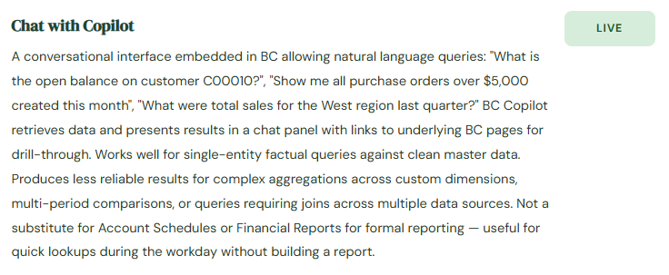 - Assume BC Copilot feature behavior is unchanged between release waves — it changes frequently
