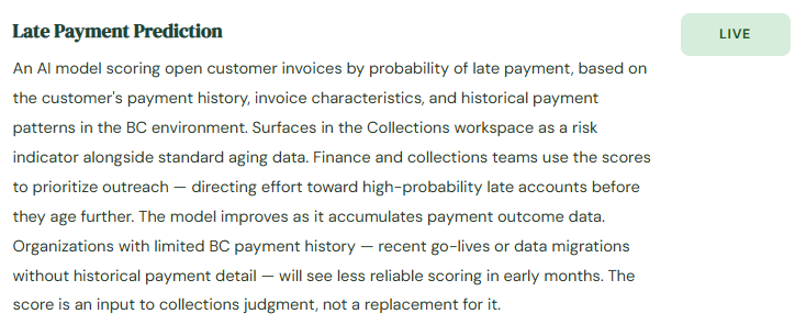 - Late payment predictions during the first 6–12 months post go-live — limited history reduces model accuracy