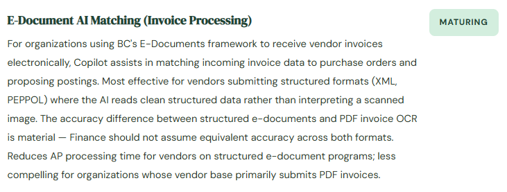 - BC Copilot presents proposals with a consistent interface regardless of underlying confidence level. Finance staff who aren’t trained on what the AI pattern-matches from will tend to trust the presentation. The training Finance teams need isn’t “how to click approve on a Copilot proposal” — it’s “what should I independently verify before accepting this, even though the AI presented it confidently?” For bank reconciliation: always compare the proposed matched amount to the bank statement amount before accepting. For e-document matching: verify the vendor name on the proposal against the invoice header. The verification checklist is the control; the training is what ensures staff actually apply it.