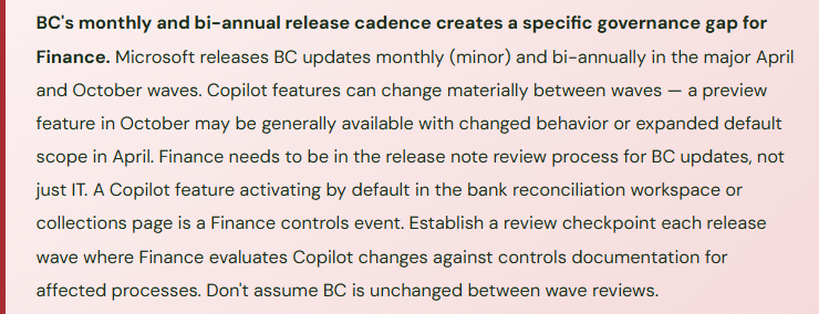 - Include BC Copilot feature changes in Finance controls review at each release wave