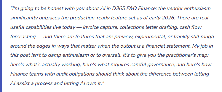 What AI-assisted features are actually live in the Finance modules, where they genuinely reduce work, where they’re still maturing, and how Finance teams should govern AI adoption in an environment where the output ends up in audited financial statements.