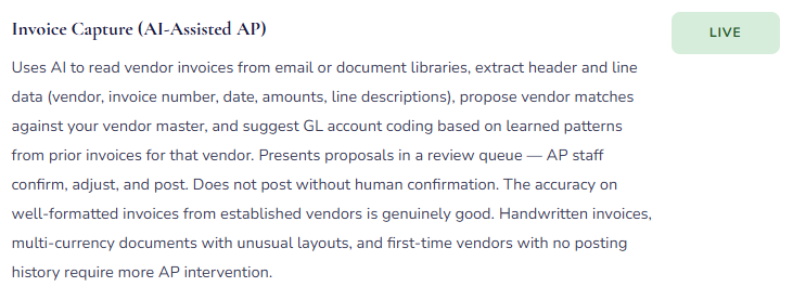 • The implementation partner says “Copilot is included — want to turn it on?” Finance says yes because it’s new and Microsoft is excited about it. Invoice Capture goes live. AP staff are trained. Three months later, the AP team reports that Invoice Capture is adding work rather than reducing it — the volume of invoices with non-standard layouts or first-time vendors is high enough that the queue of exceptions requiring manual correction takes as long to process as the original manual entry workflow. The feature wasn’t wrong; it was applied to a transaction population where its accuracy rate isn’t high enough to generate net efficiency.