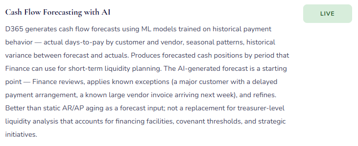 Feature availability changes with every release wave. What follows reflects the D365 F&O Finance AI feature set as of early 2026. Treat specific feature names as directional — confirm current availability in Microsoft’s release notes before planning any implementation.
