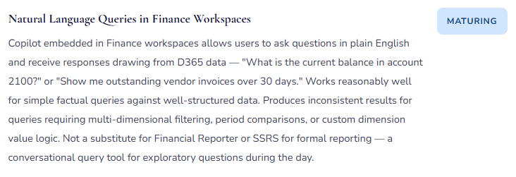 Microsoft has organized its AI capabilities in D365 F&O under the Copilot umbrella — a broad term covering features that range from genuinely impressive (intelligent document recognition that accurately reads vendor invoices and proposes GL coding) to aspirational (natural language queries across financial data that work well in demos and inconsistently in production environments with complex dimension structures).