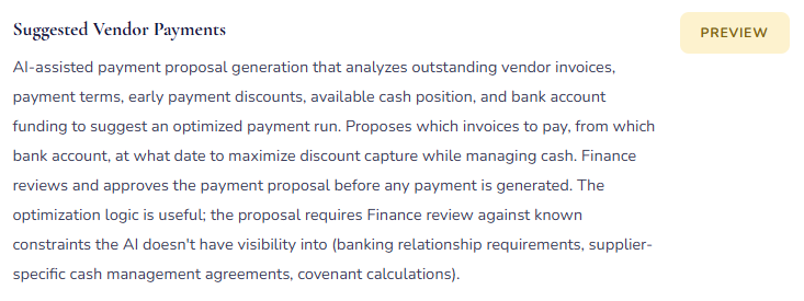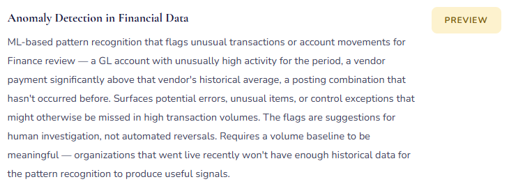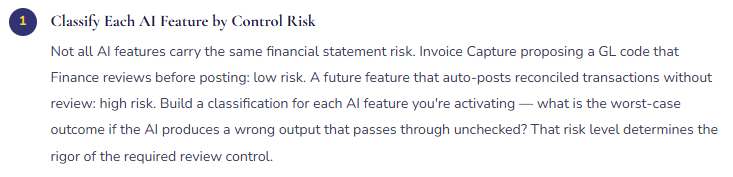 That’s not a limitation to be apologized for — it’s the appropriate control structure. The moment Finance removes itself from the review step because “the AI handles it,” the control fails. Not because AI is unreliable in general, but because the AI was trained on patterns, and your specific posting profiles, your specific vendor relationships, your specific business rules, and your specific unusual transactions are exactly where pattern-matching produces wrong answers that look right. The review step exists to catch those cases. Design AI adoption with the review step as permanent infrastructure, not a temporary training phase.