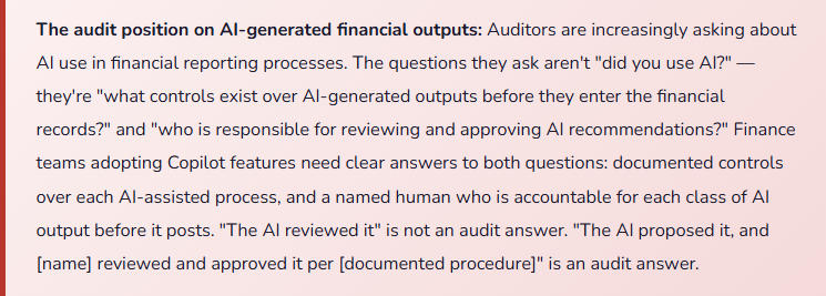 • The treasury team uses Copilot-generated cash flow forecasts in the weekly cash position report. The CFO reviews the report and asks a question about a specific forecast assumption. The treasury analyst doesn’t know the answer — the number came from the AI and they presented it as the forecast without understanding the model’s inputs or assumptions. This is the management reporting equivalent of using an Excel formula you don’t understand: the output looks like analysis, but the person presenting it can’t defend it.