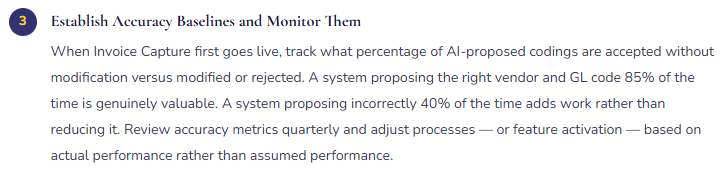 • Fix: Before activating any AI feature, define the problem it’s solving and the measurable outcome that would indicate success. For Invoice Capture: “We process 800 vendor invoices per month; the AI should accurately propose vendor and coding for at least 70% without modification, reducing AP processing time.” Set that baseline expectation before go-live. Measure it at 60 and 90 days. Adjust the process — or the feature activation decision — based on actual performance data.