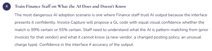 • Train Finance staff on what the AI pattern-matches from and where it can fail