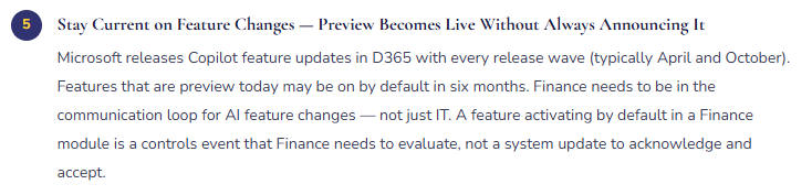 • Stay current on release wave changes — preview features activate by default without always notifying Finance