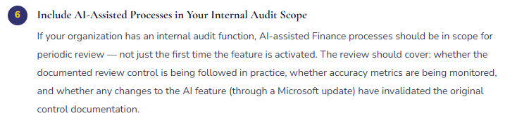 • Assume AI features are SOX-ready without reviewing Microsoft’s shared responsibility documentation