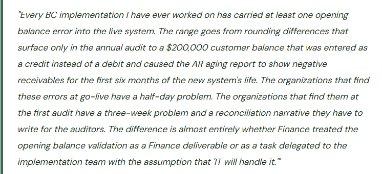 The implementation timeline is tight. The go-live date is fixed. The migration data is loaded on the weekend before go-live Monday. Finance is asked to “review and confirm” the opening balances but is given four hours on Sunday evening to do so. Finance spots-checks three customer balances, confirms the total AR looks approximately right, and signs off. Go-live proceeds. At the first-month close, Finance discovers: two customers whose balances are swapped (a payment was applied to the wrong customer in the legacy system extraction), a vendor whose balance is loaded twice (an extraction error), and four fixed assets with a negative NBV because the accumulated depreciation exceeded the acquisition cost in the legacy data and BC accepted the entries without flagging the logical impossibility. Correcting these errors while operating a live system and closing the first period takes three weeks and produces a messy audit trail.