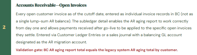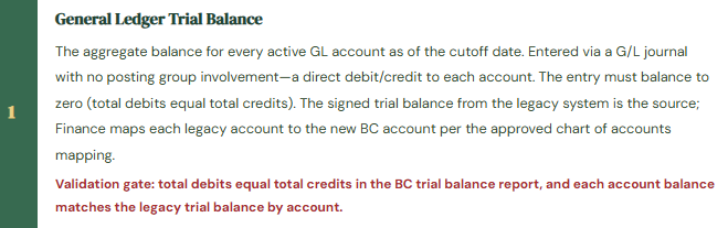 • The validation that every customer balance, vendor balance, and open invoice matches the legacy system to the penny before go-live