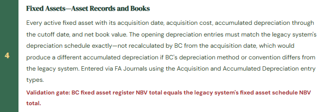 Fix: Fixed asset opening balances must be entered using the Acquisition Cost and Accumulated Depreciation entry types in the FA Journal, with the accumulated depreciation amount matching the legacy system exactly—not recalculated by BC. After the opening entries are posted, the BC fixed asset register NBV by asset must be compared to the legacy system’s fixed asset schedule NBV by asset, and any difference greater than a defined tolerance must be resolved before go-live. The depreciation method and convention in BC should be set to match the legacy system’s treatment for existing assets; new assets acquired after go-live can use BC’s native depreciation rules.