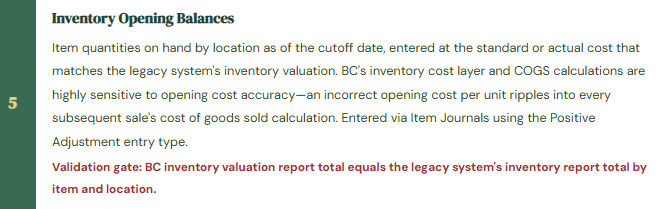 Inventory is loaded into BC at standard cost, but the standard cost loaded is last year’s standard cost because the current year standard cost update had not yet been processed in the legacy system at migration time. The difference between last year’s standard cost and the current year’s standard cost is $2.40 per unit for the primary product. With 45,000 units of that product sold in the first year on BC, the COGS understatement is $108,000. Gross margin is overstated by $108,000 for the entire first year. The variance surfaces when Finance reconciles the physical inventory at year-end and the inventory value per the physical count doesn’t agree to BC’s inventory valuation report.