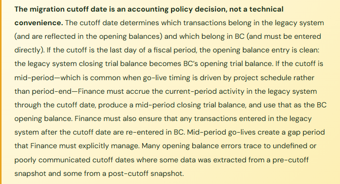 Fix: When go-live is mid-year, the opening retained earnings entry in BC must include: the prior-year ending retained earnings balance plus the current-year net income through the cutoff date. The current-year net income is calculated from the legacy system’s year-to-date income statement as of the cutoff date. This number represents all earnings since the last fiscal year-end that have not yet been closed to retained earnings. If BC’s income statement accounts start from zero on go-live date (which is the standard approach), the opening retained earnings must absorb all of the pre-cutoff current-year activity. Finance must calculate and validate this number independently before signing off on the opening balance entry.