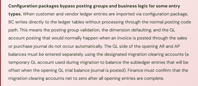 For opening balance migrations, the most commonly used configuration packages are: G/L Account (for chart of accounts setup), Customer (for customer master data), Vendor (for vendor master data), Customer Ledger Entry (for open AR invoices), Vendor Ledger Entry (for open AP invoices), and Fixed Asset (for asset records). The package import validates required fields and data types but does not perform accounting validation—it will not catch a customer balance loaded with the wrong sign or a fixed asset loaded with accumulated depreciation that exceeds the acquisition cost. Those validations are Finance’s responsibility, performed in the reconciliation framework above.