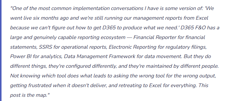 D365 F&O doesn’t have one reporting tool. It has six distinct reporting capabilities, each designed for a specific class of output. The tool selection decision should be driven by what you need to produce — and the wrong tool for the job will produce a frustrating implementation experience even when the tool itself is working correctly.