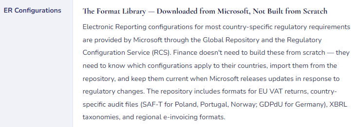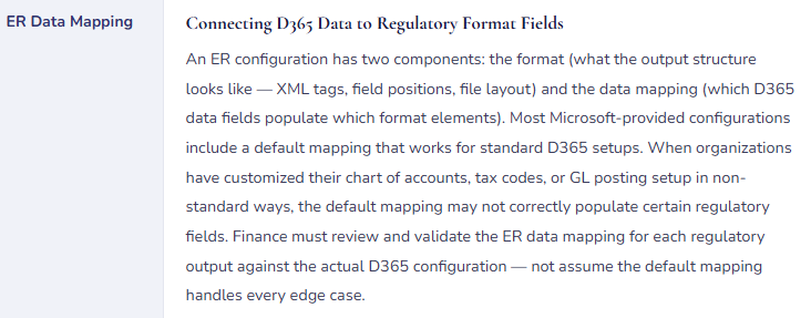 Electronic Reporting is the D365 F&O tool Finance teams most frequently underestimate at implementation time. It feels like a technical feature — format configurations, ER designers, XML schemas — so it ends up in the IT workstream during implementation rather than the Finance workstream. And then the organization operates for six months, the first quarterly VAT filing comes due, and Finance discovers that the ER format configuration for their country hasn’t been imported, isn’t current, or isn’t mapped to the right GL accounts. The regulatory filing is due in two weeks. The implementation partner is off the engagement. The urgency is real.