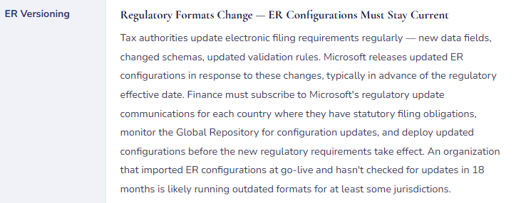 A country’s VAT authority updates its electronic filing schema — adds two new required fields effective next quarter, changes the XML namespace, modifies the validation rules for existing fields. Microsoft releases an updated ER configuration three weeks before the effective date. The D365 Finance team doesn’t have a monitoring process for ER configuration updates — they’re not subscribed to regulatory update notifications, they don’t periodically check the Global Repository for new configuration versions. The effective date passes. The first filing under the new rules is submitted using the old ER configuration. The filing is rejected. The organization has days to identify the problem, import the updated configuration, test it, and resubmit before facing penalties for late filing.