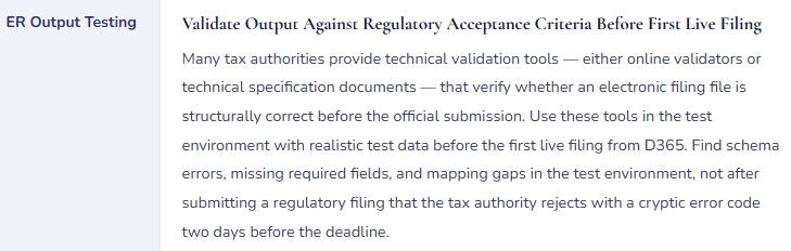 - Test ER outputs against regulatory validators in the test environment before first live filing