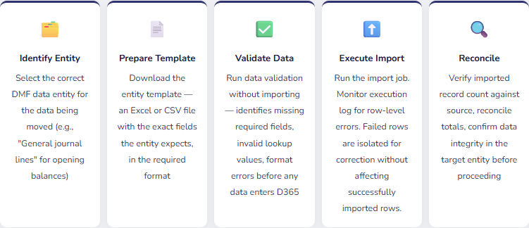 - Validate DMF imports with the validate step before executing — find errors before data enters D365