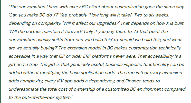 Fix: Before approving a customization request, Finance should ask whether the process being automated is the right process or just the current process. BC implementations are an opportunity to redesign processes, not just digitize them. If the process being replicated in a custom extension is inefficient, ambiguous, or likely to change, the customization investment is a liability from day one. The decision framework: Is this process required by regulation, audit, or contractual obligation? If not, should the process be redesigned to leverage BC’s native capabilities before we add code to make BC accommodate the current process? The answer is not always “change the process”—but the question must be asked before the customization is approved.