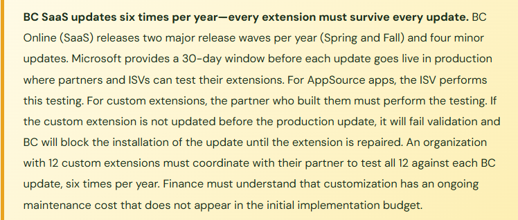 During implementation, the partner builds a custom extension that automates the monthly intercompany journal allocation calculation—a genuinely useful tool that saves Finance three hours per month. The partner invoices for the extension, delivers it, and it works perfectly. Eighteen months later, a BC update changes the posting codeunit that the extension subscribes to. The extension is not updated to match. BC blocks the production update. Finance cannot process any transactions until the extension is compatible. The partner who built the extension was a contractor who no longer works for the firm. The firm’s current partner has to reverse-engineer the extension, understand its logic, update it for compatibility, test it, and redeploy it—a two-week engagement that Finance didn’t budget for and couldn’t have predicted.