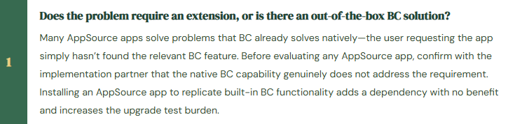 - Confirm native BC capability is truly insufficient before approving any AppSource or custom extension