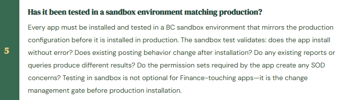 Finance teams often discover AppSource apps through Microsoft marketing, partner recommendations, or colleague referrals and want to “just try it” in production. An AppSource app installation in production is a configuration change that could affect posting behavior, financial data, report output, or user access—it must go through the same change management process as any other configuration change. The evaluation framework Finance should apply to every AppSource app under consideration: